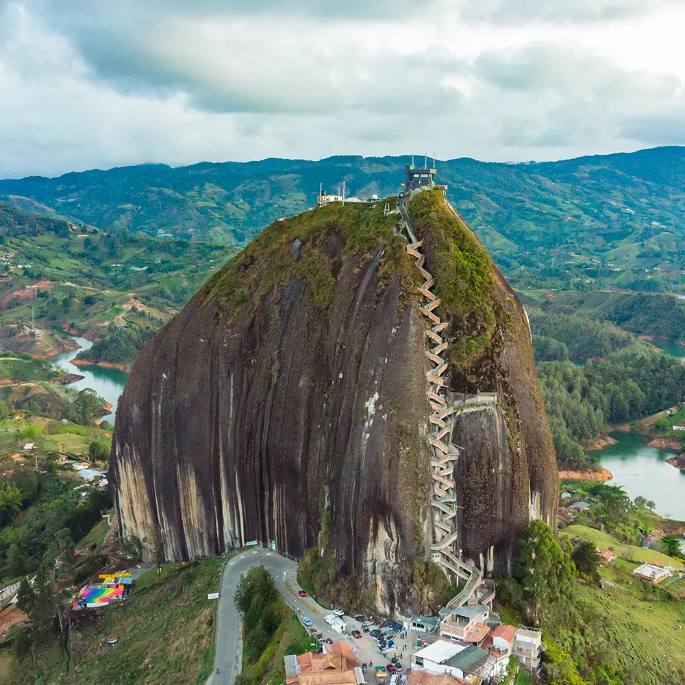 Uno de los destinos más icónicos de Antioquia. La Piedra del Peñol es una enorme formación rocosa con más de 700 escalones para ascender a su mirador. A sus pies se encuentra Guatapé, un colorido pueblo con calles adoquinadas y los famosos zócalos en sus casas.